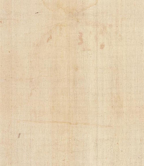 The following photograph (Figure 1) presents the middle section of the underside of the Shroud where the bloodstains from the back of the head and torso, the face, and front torso, are visible. There is no perceptible image as can be seen on the well-known front side. Some researchers claimed that a dim image of the face appears on this underside, but this is controversial. Figure 2 shows a close-up view of the face region of the underside.
