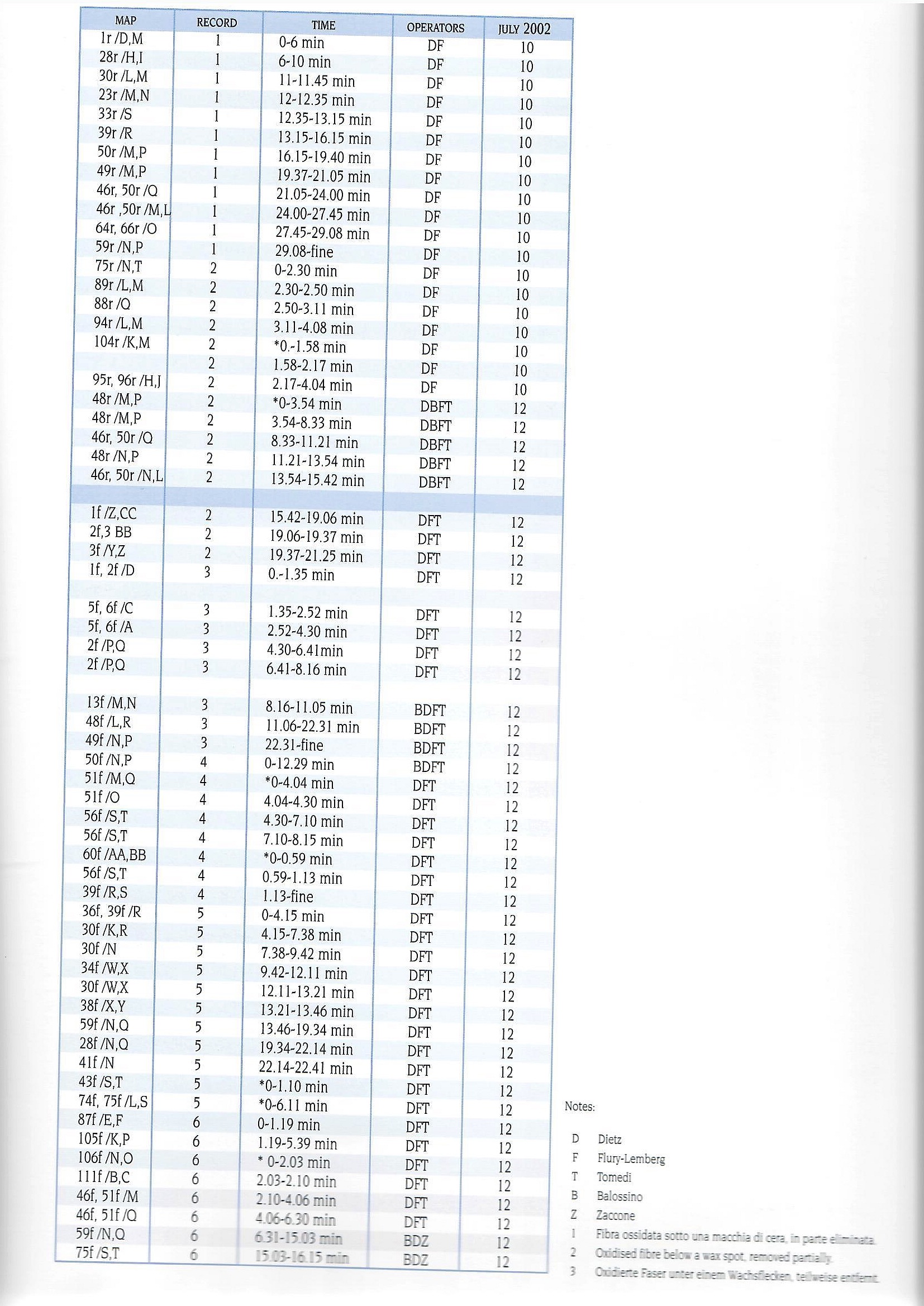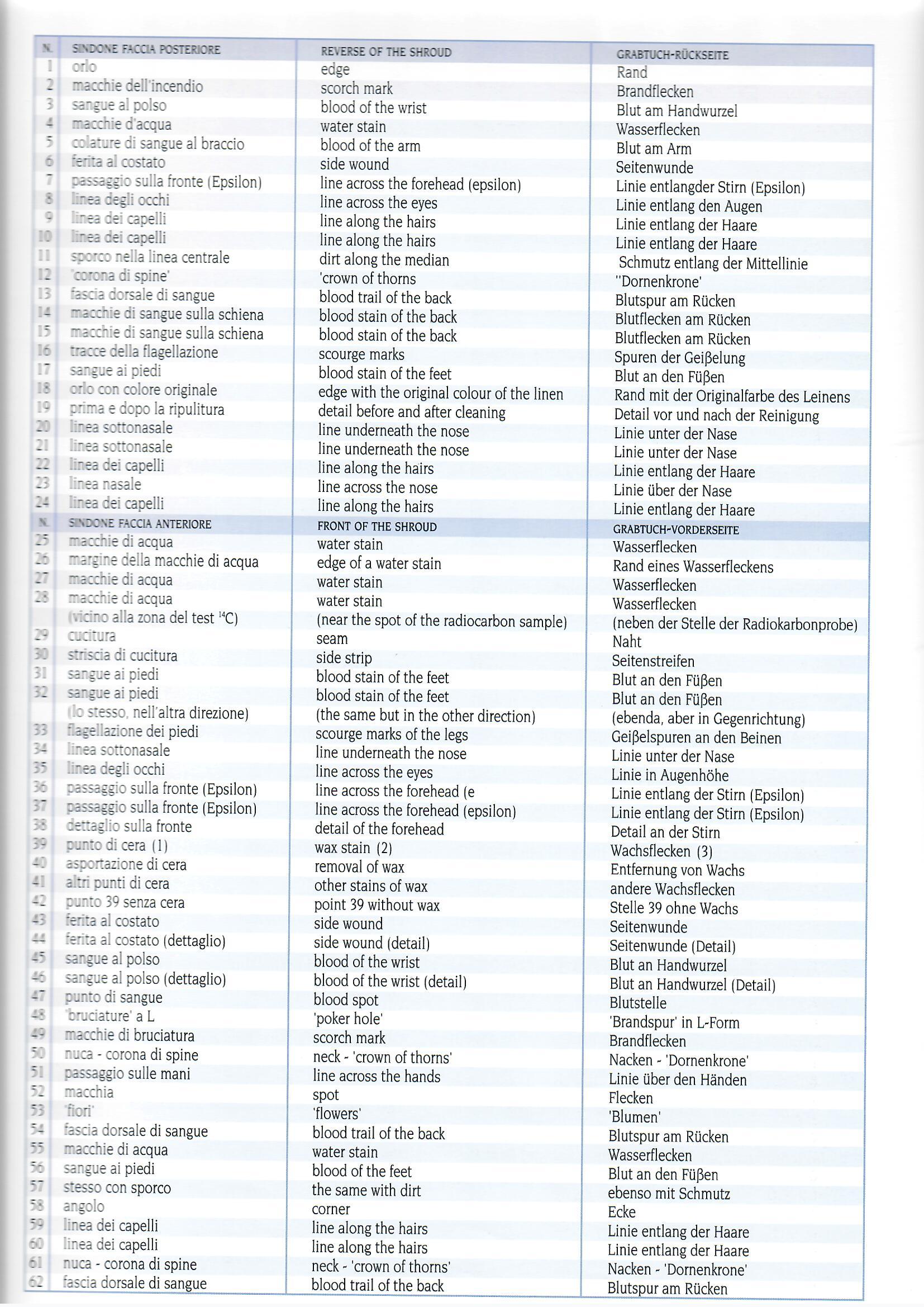 The videos are described on pages 133 to 136 in the book Sindone 2002, authored by Mechthild Flury-Lemberg, published in 2002 (see Figure 3 for these four pages). In the appendix on page 133, they are described as Videomicroscopic Photographs of the Shroud (Figure 3a) with a detailed list of the locations on pages 134 and 135 (Figures 3b and 3c), with timing and operators, and on page 136 with two photographs, the recto and verso of the Shroud, showing the locations captured by the videos with numbered line segments (Figure 3d). There are 24 videos from the verso, and 38 videos from the recto, for a total of 62 videos. The photomicrographs shown in Figure 1 are from segment 44 on the Shroud map shown on page 136, shown in Figure 3d.