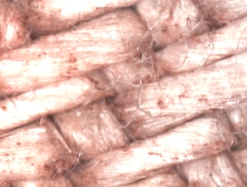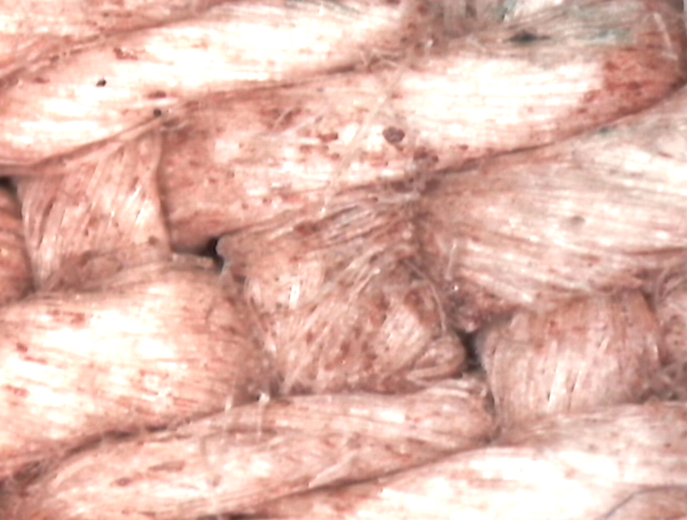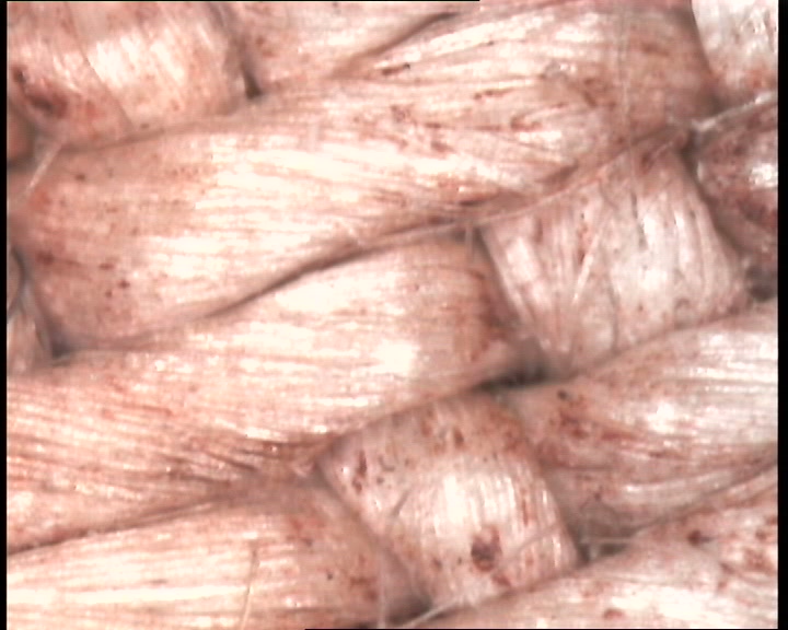 The six photomicrographs in Figure 1 were taken over a bloodstain, on the Shroud of Turin during its restoration in the summer of 2002. They were extracted from one of the many videos taken during that restoration using a camera mounted on a bidirectional track (see Figure 2). That explains a degree of their out-of-focus aspect. Their level of magnification is greater than all the photomicrographs taken by Mark Evans during the five-day STURP study in 1978 (see the Mark Evans photomicrographs and on the Shroud Scope). This magnification allows us to see more details at the level of the fibrils of the linen threads. For example, the red blood particles clearly agglutinate in very small specks, which is expected from blood. In the collection of Mark Evans, that can be envisioned on only one photomicrograph, but cannot be seen at the level of the fibrils (see the ME-06 photomicrograph ).