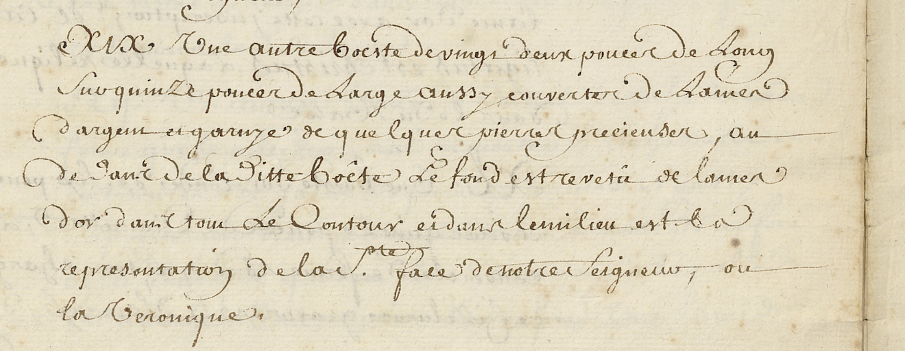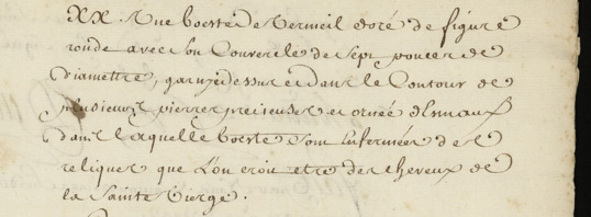Remarkably, right after the description of item 19, item 20 refers to a reliquary containing hairs of the Virgin, the same type of relic deposited at the church of the collegiate at Lirey. Figure 2 shows an excerpt of the manuscript describing this reliquary containing the hairs of the Virgin.