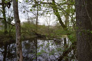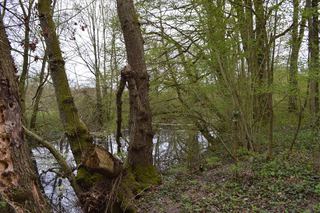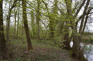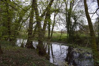 The castle (or maison forte) of Geoffroy de Charny was further back on a small slightly elevated piece of land encircled by a protective trench filled with water. The trench is still visible today and water is still keeping the visitors away. The collegiate and the castle no longer exist and their pieces of land are now private. Thanks to Alain Hourseau who made the appropriate arrangements to access the site where the castle used to be located. The following photos show the trench filled with water and the castle site filled with trees.