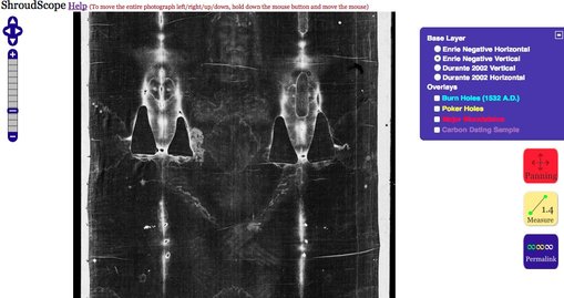The Shroud Scope Help PageThe Shroud Scope has been successfully tested on the following browsers: Firefox, Chrome, Safari and Internet Explorer (IE) version 9. Sorry, the Shroud Scope does not work on Internet Explorer (IE) version 8 or lower.This Web page describes the functionality of the Shroud Scope, a Web interface to display high definition photographs of the Shroud of Turin, zoom-in and -out these photographs, activate overlays and do length measurements over them. The Shroud Scope has currently three different photographs: the 1931 Enrie photograph (shown in negative), the full 2002 Durante photograph (shown in positive), and a face close-up also done by Durante in 2002. All photographs have two versions: vertical and horizontal. And for the Enrie photograph, a 3D anaglyph vertical version is also provided. That version requires special color filtered glasses to perceive the 3D stereo effect (See the 3D Section below for more details). At the highest zoom-in level, the Durante photograph has a resolution of 0.1905 mm per pixel (a pixel is a dot on your screen), the face close-up has a resolution of 0.08 mm per pixel, and the Enrie photograph has a resolution of 0.4262 mm per pixel. These resolutions are based on the width at the frontal end of the Shroud (the left edge when the Shroud is shown horizontally): 1120 mm for the Enrie photograph, 1130 mm for the full Durante photograph (as reported on p. 121, in Sindone 2002, by Mechthild Flury-Lemberg), and the face close-up resolution is based on a measurement done on the full Durante photograph and measured on the face close-up photograph. The widths differ betwen te Enrie and Durante photographs since, in the summer of 2002, the Shroud was removed from its 400 years old backing cloth and carefully flatten to be stiched to a new backing cloth. As far as we know, the Shroud Scope provides the highest resolution photographs of the Turin Shroud publicly available on the Web, worldwide, including the official web site of the Shroud of Turin in Italy. The initial Shroud Scope Web page contains several widgets, panels, and icons as seen on the following screen snapshot. ![]() In the following paragraphs we give brief descriptions of them but more details are available in the subsections below. The Switch Panel widget is the blue panel that appears on the right side, near the top, of the Web page. If it is closed, click the plus icon to open it. It displays two lists: Base Layer and Overlays. The list of base layers is above the list of overlays. Each base layer is a photograph of the Shroud of Turin. Only one base layer can be active at a time whereas several overlays can be active at the same time. Select the desired base layer and overlays by clicking their title or their radio button in the Switch Panel. The Ladder widget is the blue widget in the form of a ladder with over 10 steps displayed on the left of the Web page. It is used for zooming-in and -out the current active photograph (aka base layer). You can click on any ladder step to go directly to a specific zoom level. You can also use the plus icon to zoom-in or the minus icon to zoom-out. The first zoom level, the lowest, displays a 3%-scale image of the original image used at the highest zoom level. It is very small and should fit almost any computer monitor size. The second zoom level displays a 5%-scale version, the third zoom level is a 10%-scale version, the fourth zoom level is a 20%-scale version, and so on by increment of 10% up to the highest zoom level at 100%. At that zoom-level, it is the highest definition that can be displayed. The colorful rounded-square icons on the right of the Web page can be used to activate different tools. There are three tools: panning, measure, and permalink. These tools are described on this Web page below. To activate a tool icon, simply click it. An active icon that has a reddish hue means that it is active and that the state of the Shroud Scope has changed. For example, if the measure tool is active, no panning can be done, and vice versa. A tool remains active until you click another tool. When you first visit the Shroud Scope Web page, the panning icon is active. The panning icon enables you to move (or pan) the entire photograph on the Web page. The Base LayersA base layer is essentially the main Shroud photograph shown on the Web page. Currently, three images are available, displayed horizontally or vertically, plus a 3D anaglyph version, that is seven base layers are provided: Enrie Negative Horizontal, Enrie Negative Vertical, Durante 2002 Horizontal, Durante 2002 Vertical, Face Only Horizontal, Face Only Vertical and Enrie Negative 3D Vertical. More base layers are planned for the future. The Durante 2002 photograph has the highest definition. As far as we know, this is the highest definition photograph available on the Web, worldwide. To select a different base layer, click the title or the circle next to the title, of the desired base layer. If the selection is different than the current displayed base layer, the current displayed photograph will be replaced with the new selected photograph at the same zoom level and at the same centered location as the current displayed one. PanningPanning is required at some zoom levels since zooming-in will increase the level of the details and the entire photograph will become larger or wider than the size of your computer monitor. Panning is the operation of moving the entire photograph left/up/down/right as if you were grabbing a piece of paper. When the Shroud Scope is first displayed, panning can be done by holding the left mouse button and moving the mouse in the desired directions. The entire photograph will move. Therefore, the scrolling bars are not used to move the photograph. Likewise, if your mouse has a wheel, it no longer can be used to move the photograph. The wheel can actually be used for the zoom-in and -out operations (see next subsection). Note that once the measureme